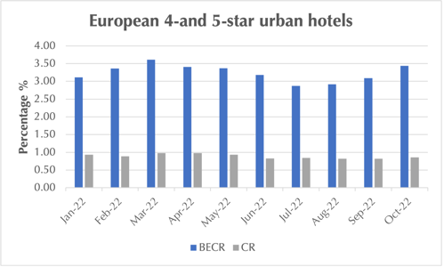 This graph compares the website Conversion Rate (CR) with the Booking Engine Conversion Rate (BECR) for 200+ European 4- and 5- star hotels between January and October, 2022.