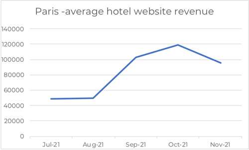 Website revenue for Paris hotels has followed a very similar pattern just tailing off in November. In October revenue booked directly was at a 2021 high up 145% from July at Euros 139,000.