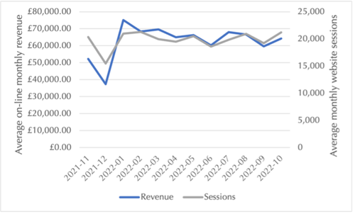 In spite of the cost-of-living crisis, the UK hotel sector is not seeing any significant website revenue drop, with revenue levels staying very much in line with website sessions, tapering off over the summer months and tracking upwards since August.