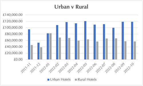 A January rebound fuelled by pent-up demand from families missing out on Christmas get-togethers and celebrations benefitted rural and urban properties alike but from February onwards city hotels have been the real winners for revenue booked on-line. In September and October, average on-line revenue for city 4- and 5-star hotels more than doubled their rural counterparts. Buoyed by strong levels of pent-up demand and the fall of the pound against the dollar, UK cities with an international draw have attracted more and more overseas visitors.