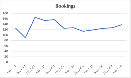 The chart below maps average transaction volumes for UK hotel websites over the last 12 months. The dip at the end of 2021 reflects the impact of the Omicron variant, with bookings then tracking upwards to reach their peak for 2022 (YTD) in January with an average of 165 monthly transactions. Between June and October transactions have trended upwards with an increase of 21% overall.
