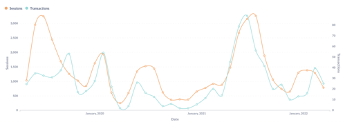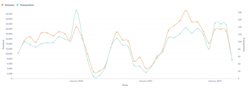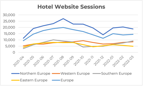 Website sessions in other European regions have remained pretty stable, dropping off with the arrival of the Omicron variant and picking up at the start of 2022.