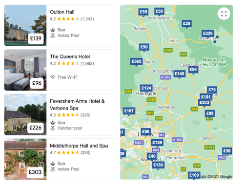 Local search results for hotels display a selection of the top four most relevant results often referred to as either the hotel ‘four pack’ or ‘local pack’ underneath any paid ads and alongside a map with pins giving their location. Underneath then follows a list of organic results.