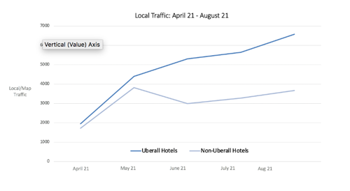 A comparison across a set of similar hotels showed a significant increase in Google Local traffic for those on the Uberall platform between April and August this year.