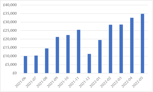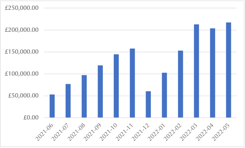 Average Google Ad spend in May was £2611, on par with May, 2019 and +115% on May, 2021.