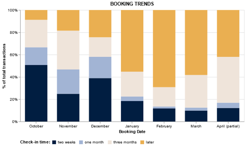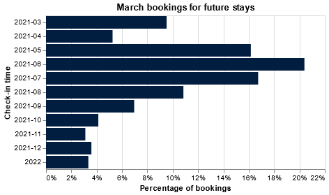 March shows a similar booking pattern, with customers reserving summer stays (June, July and August) accounting for 49% of all hotel stays just three months out rising by 10%.