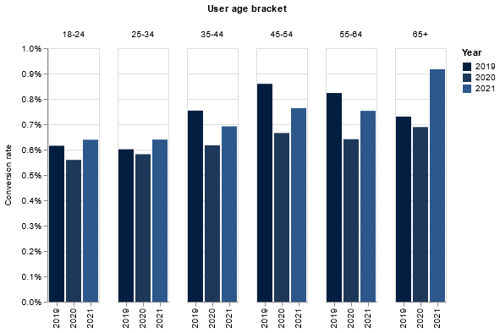 Where younger age groups are showing distinctive increases in browsing, the over 65 age group are showing the most significant gains in conversion rate between 2019 and 2021 and one of the highest conversion rates across 2019-2021 as well as across all age groups.