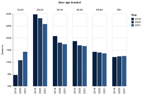 Younger people chasing adventure and with a desire to travel even in today’s climate are a huge consideration for hotels. In 2019, users in the age bracket 18-24 years made up just under 5% of website sessions, increasing to 11% in 2020 with a jump to just under 15% of sessions in 2021, an overall increase of 10%. Users in age brackets between 25-64 years have shown a combined decrease of 11% in website sessions between 2019 and 2021 while the 65+ age group has remained relatively stable.
