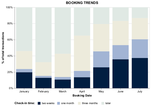 For UK leisure hotspots, last month saw a surge in bookings/transactions with 60% of July bookings made for stays within 30 days. The pandemic has shifted guest behaviour towards much shorter booking windows. Lead times were at their shortest since January 2021.