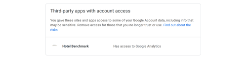 Applications can also be granted access to your Google Analytics account. To check which apps you have granted access to, go to https://myaccount.google.com/permissions and remove any apps that you do not recognise. Just make sure to keep Hotel Benchmark in there 😉